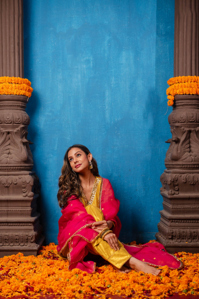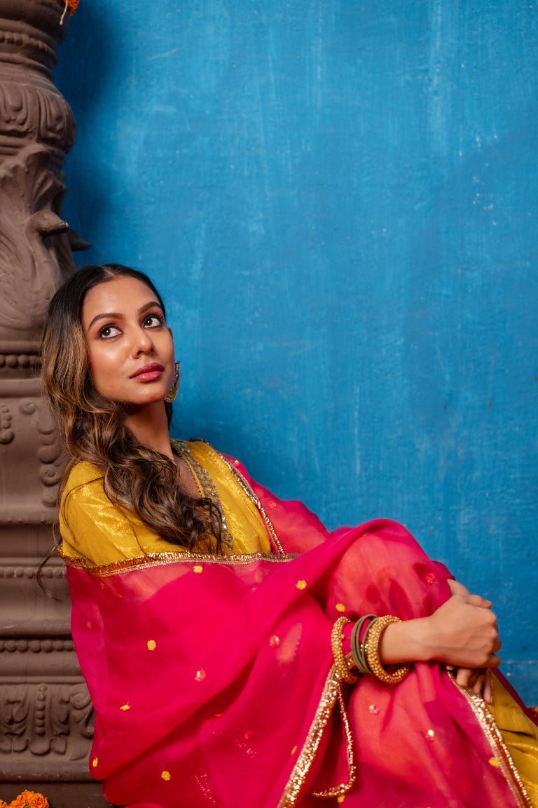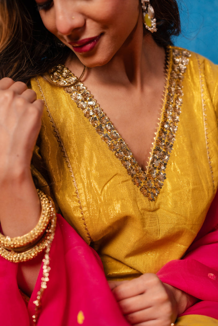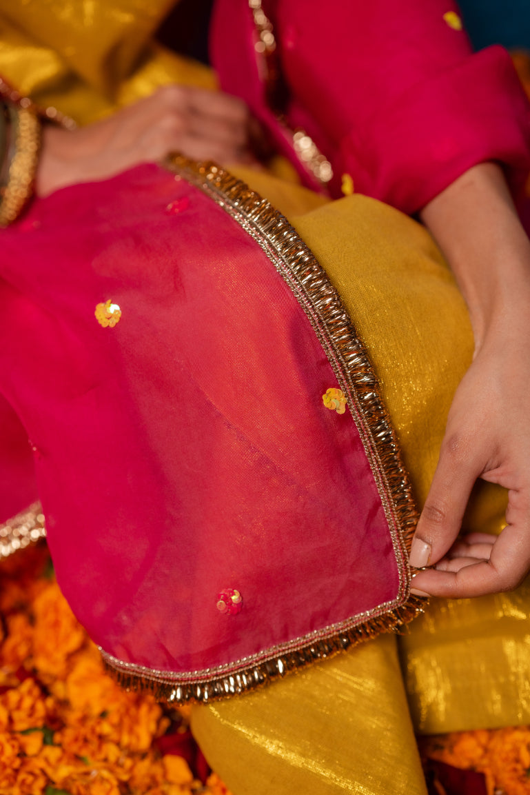 Haldiya Suit Set – A charming dusty yellow kurta set paired with a contrasting pink dupatta. The neckline is adorned with delicate gold sequin embroidery, while the dupatta features multicolor embroidered highlights and a rich gold border. Finished with soft cotton lining and extra margin for an easy, comfortable fit.