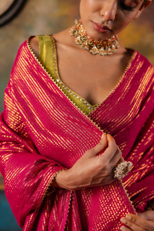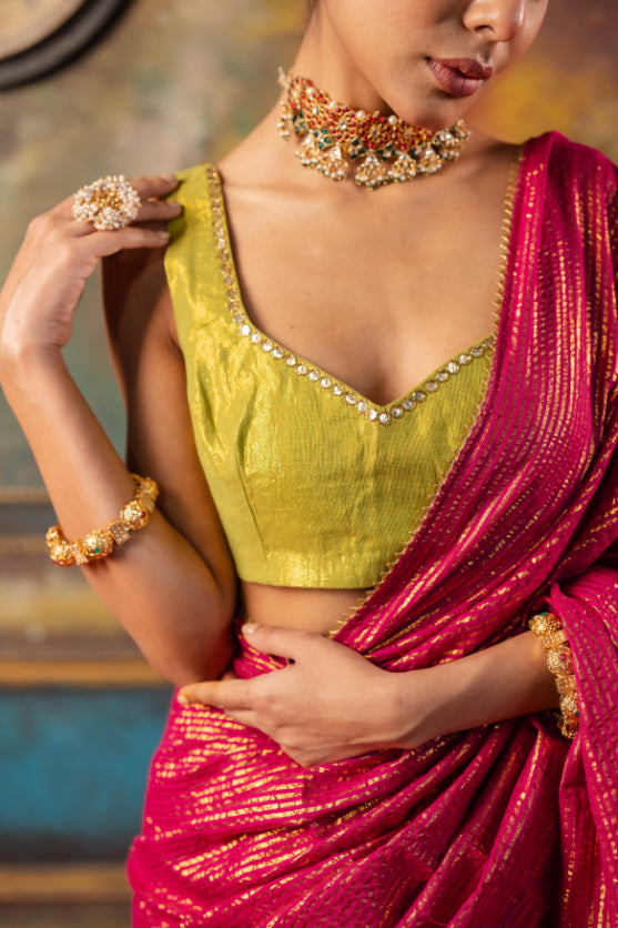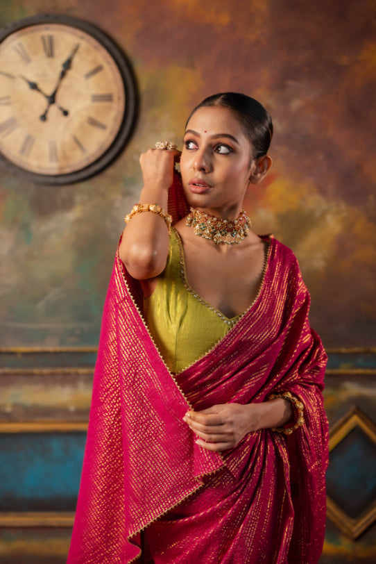Taarini Saree – An elegant cotton saree featuring bold gold metallic zari stripes and a refined gold border, paired with a contrasting green blouse for a timeless, festive appeal.